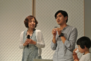 【写真:おおくにあきこさんと浜尾和徳さんとすいすい君】