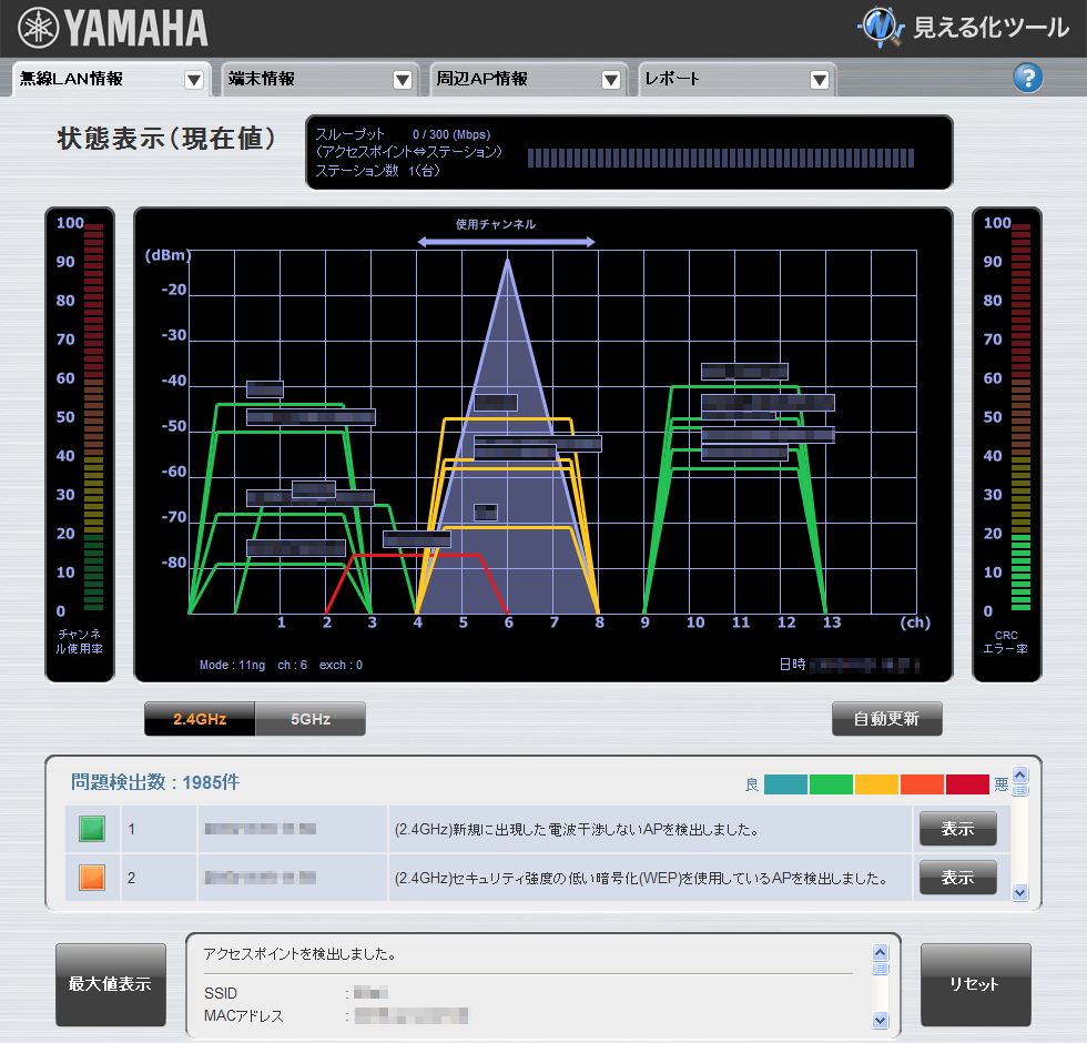 周囲にたくさんの無線アクセスポイントがあり、とても混雑しているのが分かります。